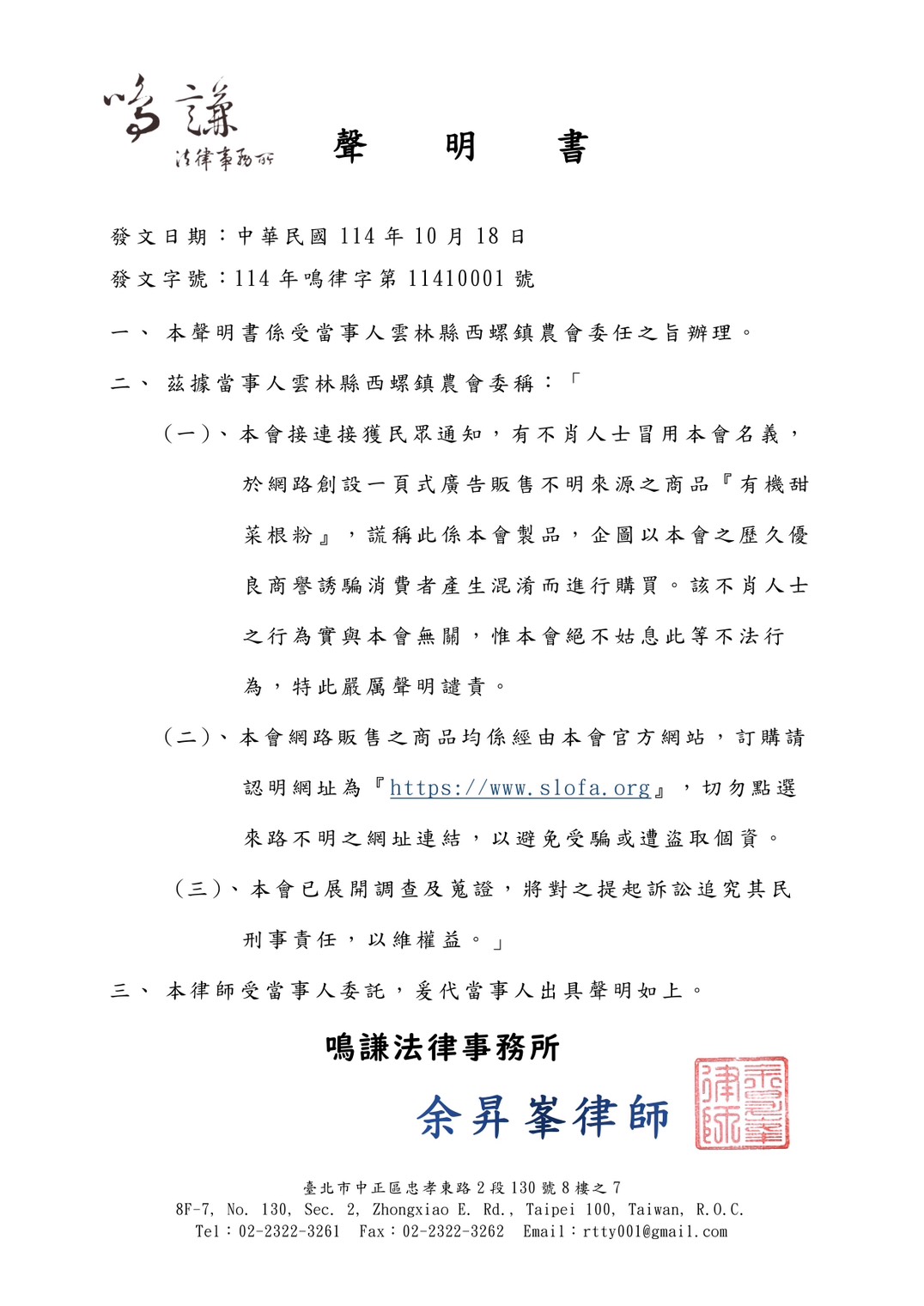 首頁/最新消息/【公告】近期發現有不肖人士冒用本會名義於網路販售商品,嚴重損害本會名譽與消費者權益;為維護本會權益,特此公告並呈上律師聲明書,提醒民眾切勿受騙;若有疑慮,請洽本會官方管道查證:電話05-5863621 【公告】近期發現有不肖人士冒用本會名義於網路販售商品,嚴重損害本會名譽與消費者權益;為維護本會權益,特此公告並呈上律師聲明書,提醒民眾切勿受騙;若有疑慮,請洽本會官方管道查證:電話05-5863621西螺 農會2025-10-18最新消息